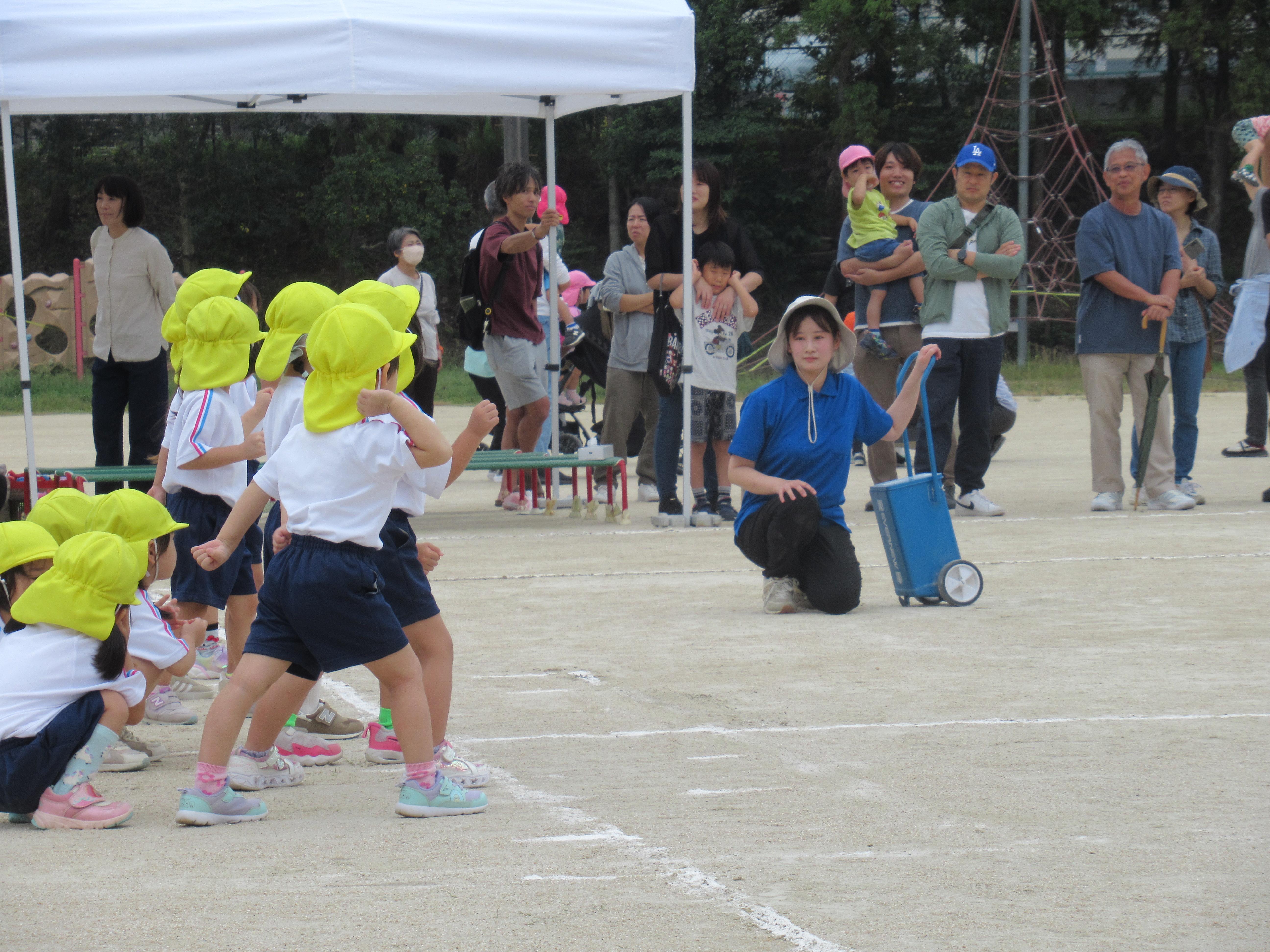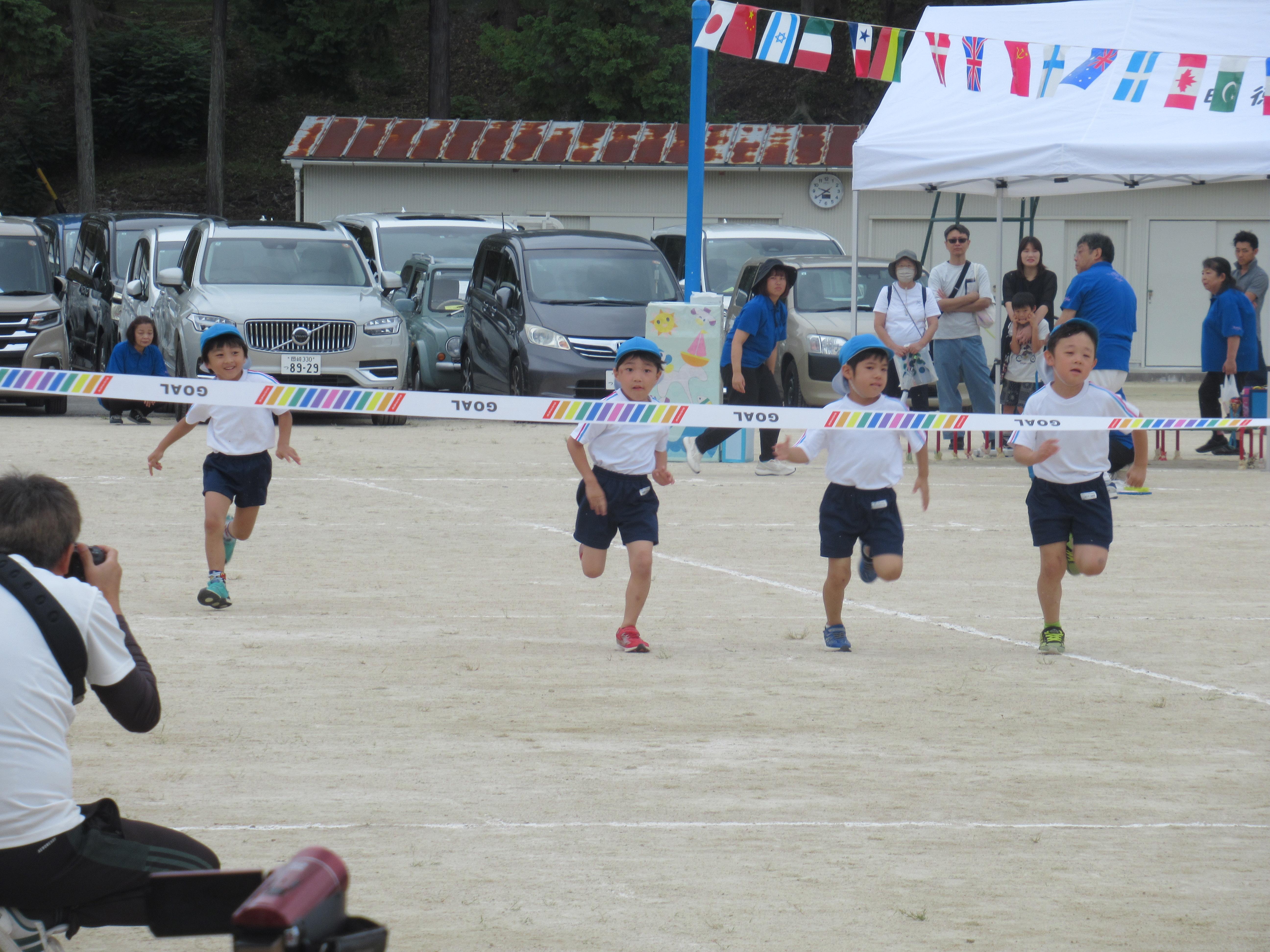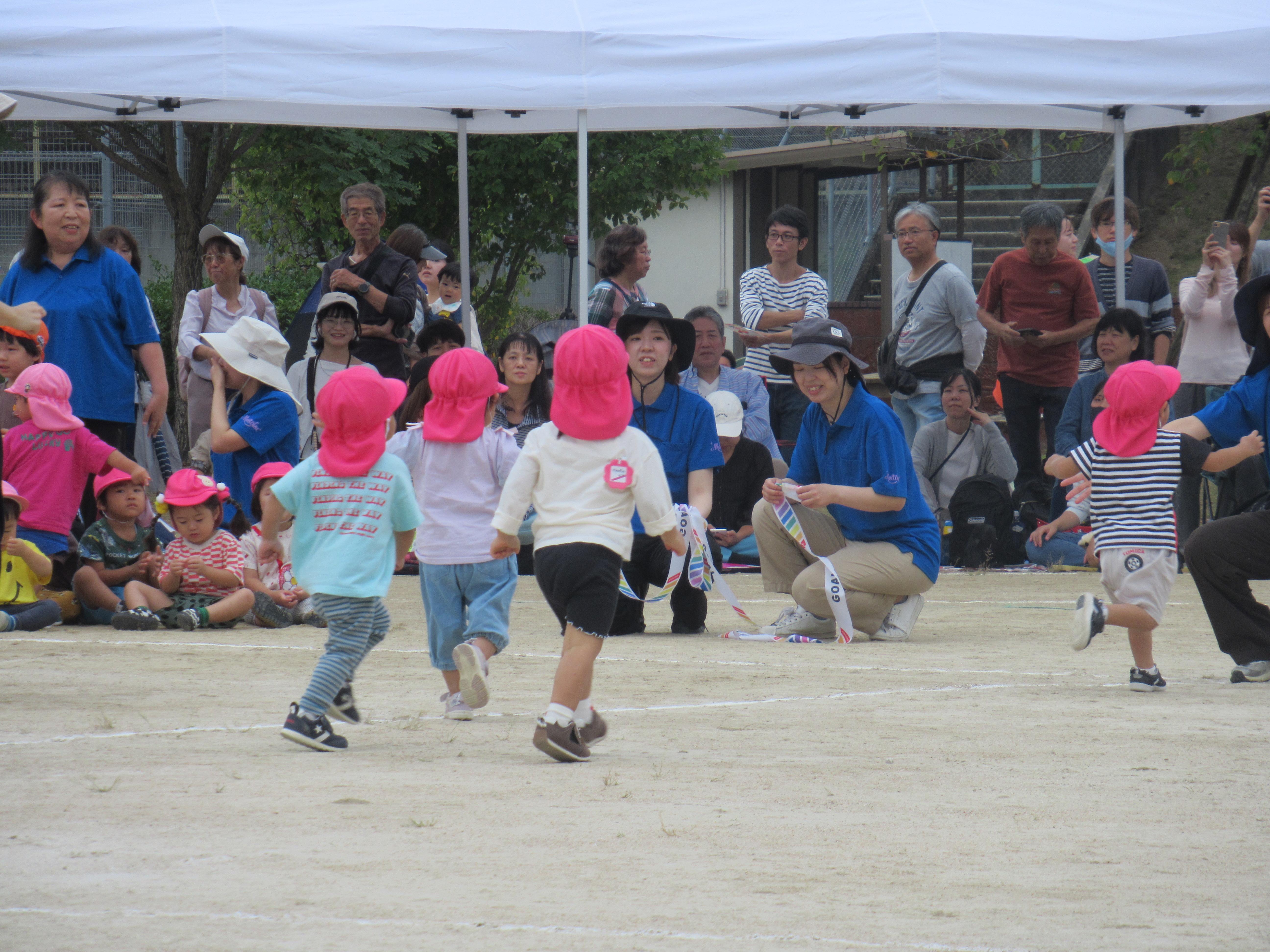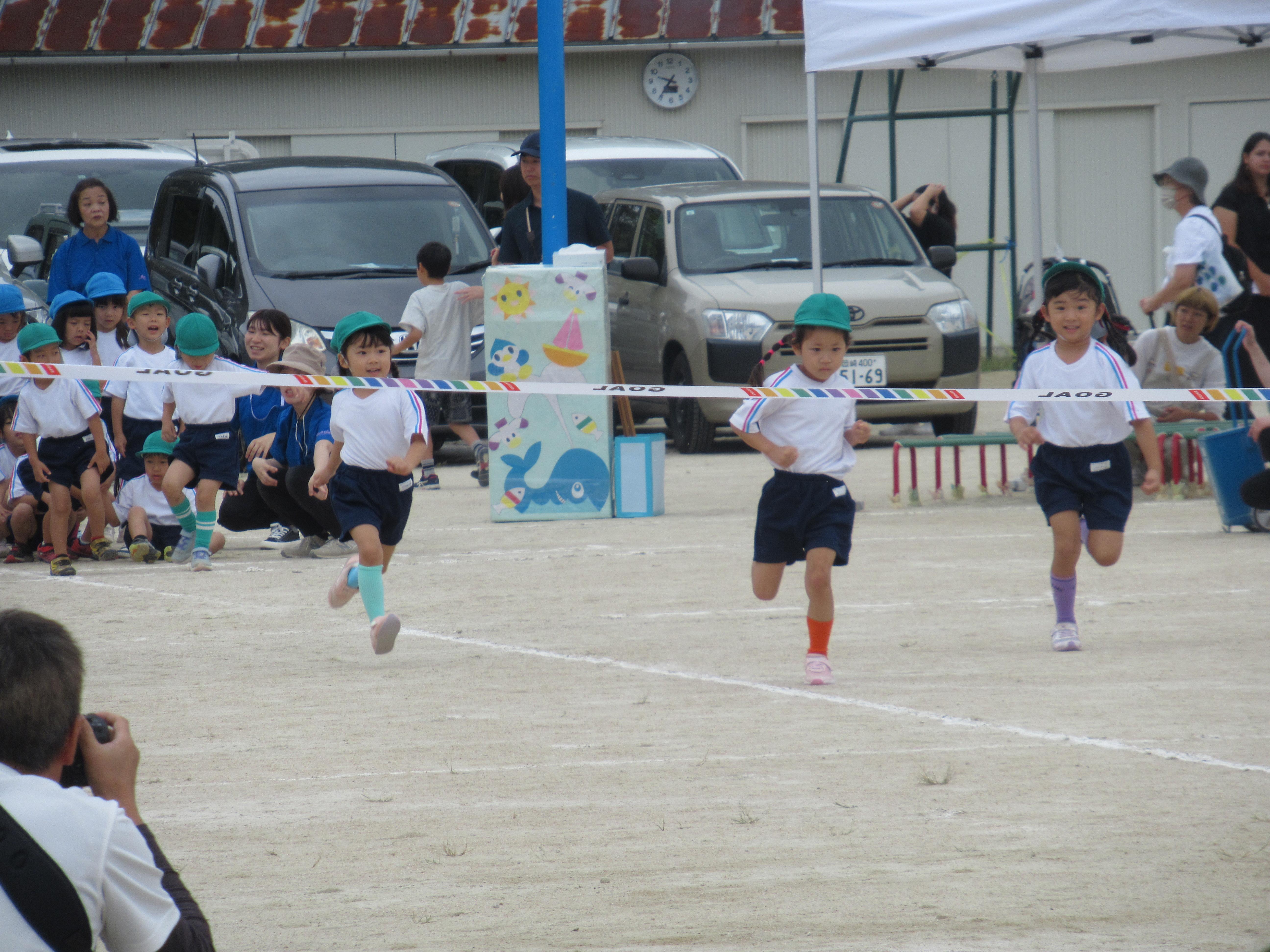 かけっこは、2歳さんから青さんが行いました!みんな一生懸命ゴールまで頑張りました!!