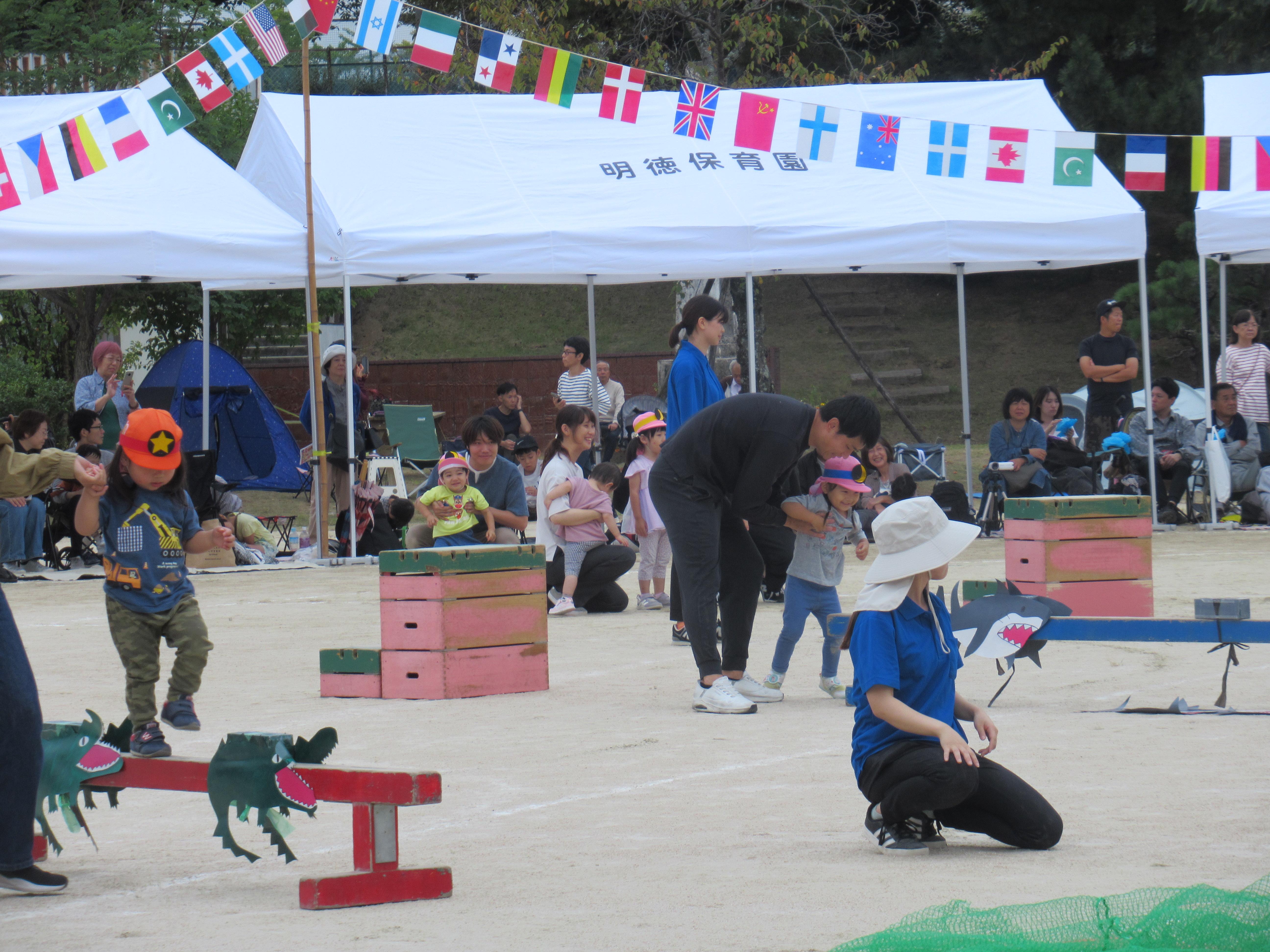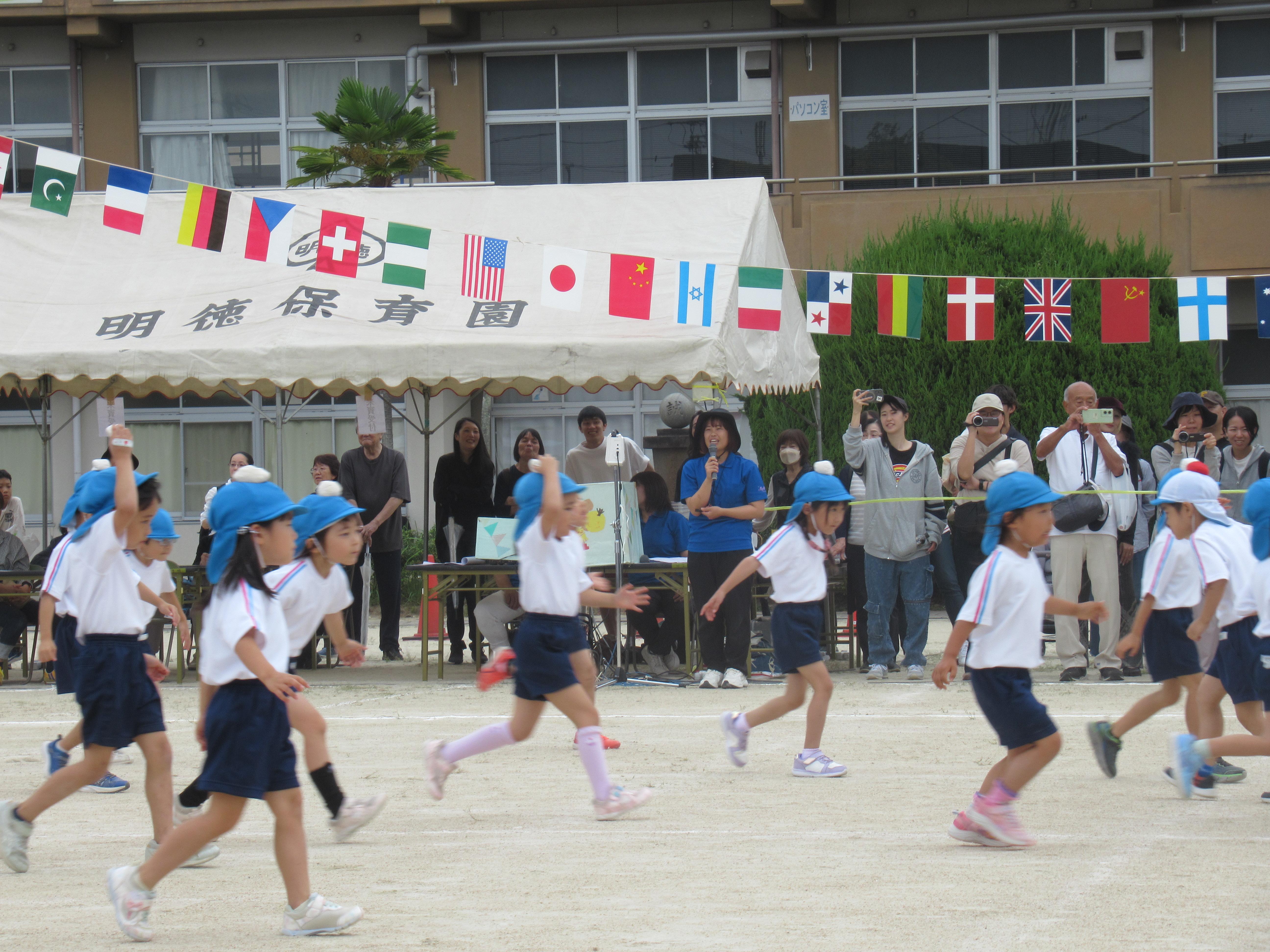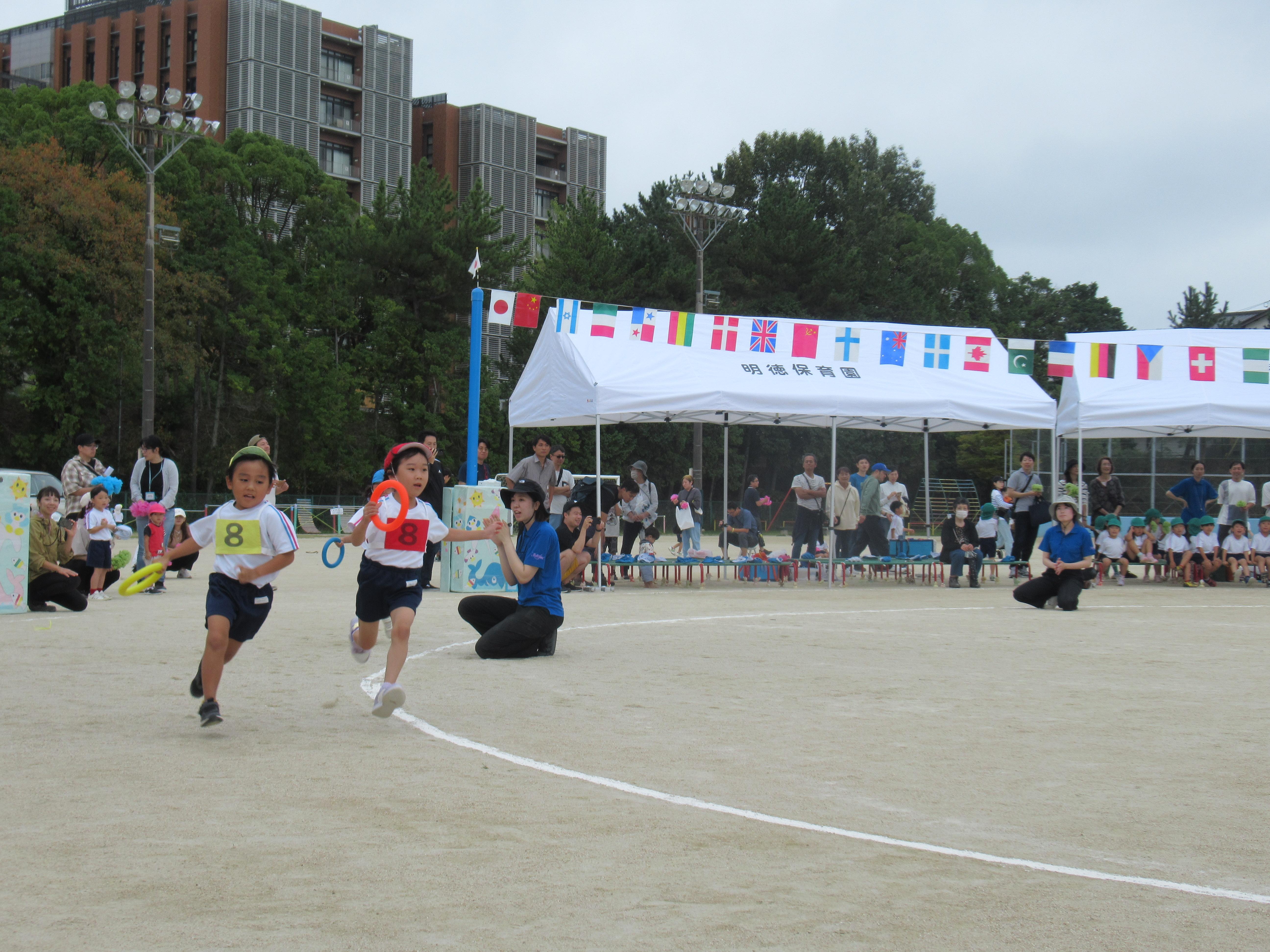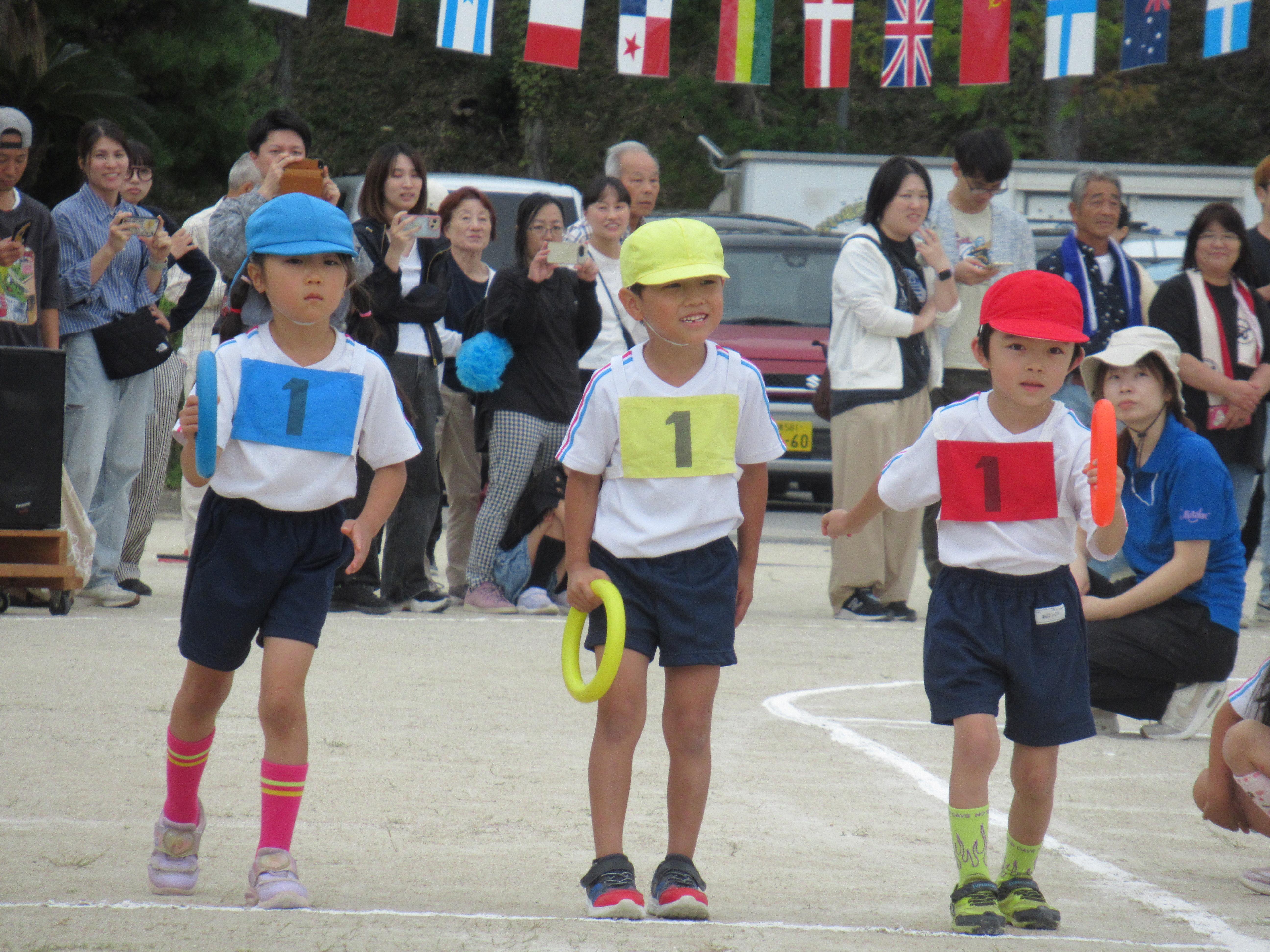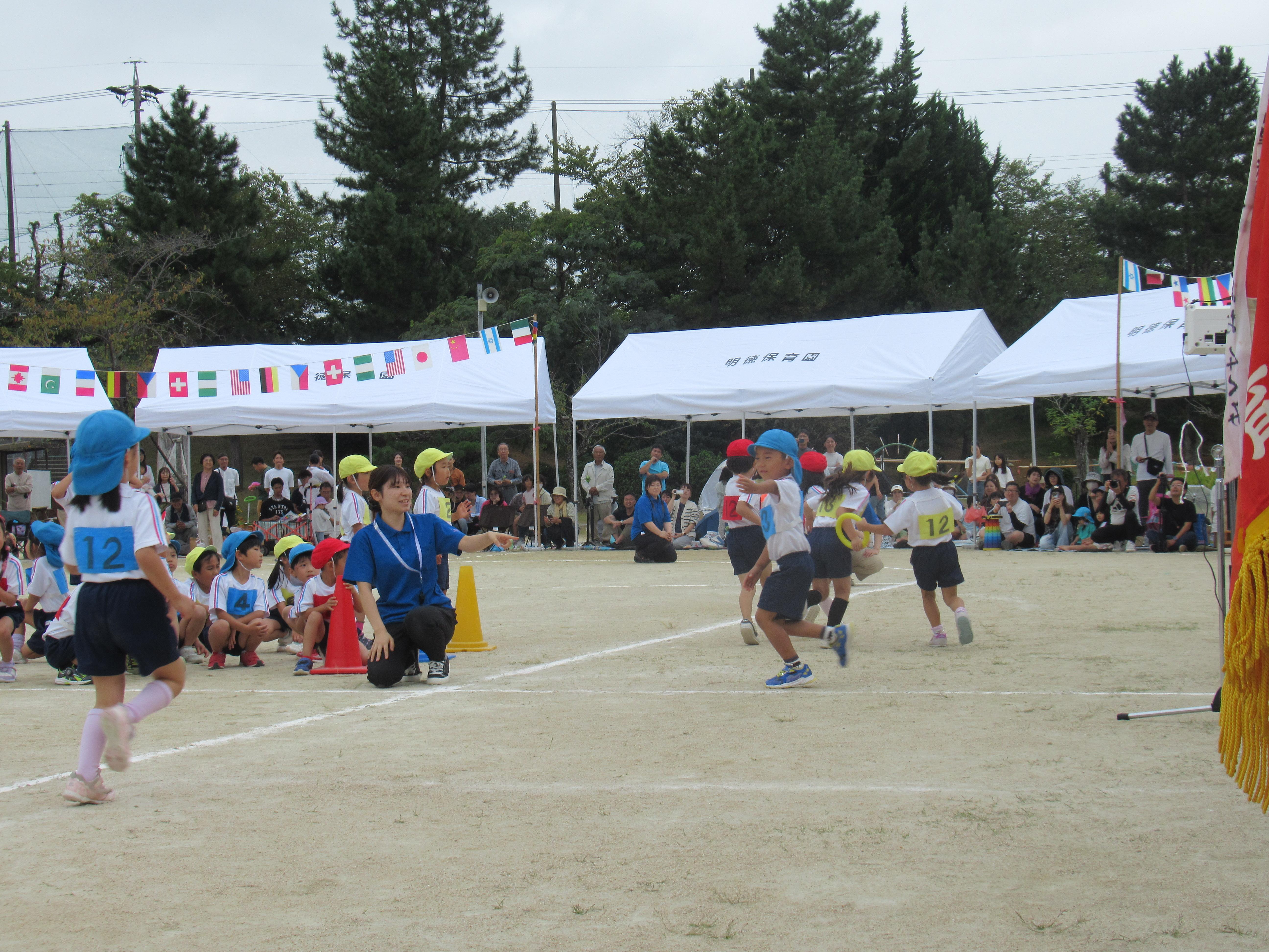 かけっこは、2歳さんから青さんが行いました!みんな一生懸命ゴールまで頑張りました!!